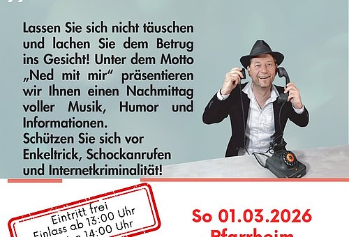 Unter dem einprägsamen Motto „Lassen Sie sich nicht täuschen und lachen Sie dem Betrug ins Gesicht“ präsentieren die Gemeinde Wörth a. d. Isar, Polizeiobermeister Rudolf Schmuderer und Kabarettist Tom Bauer das Präventionskabarett „Ned mit mir“ – eine unterhaltsame und zugleich praxisnahe Aufklärungstour durch Niederbayern.