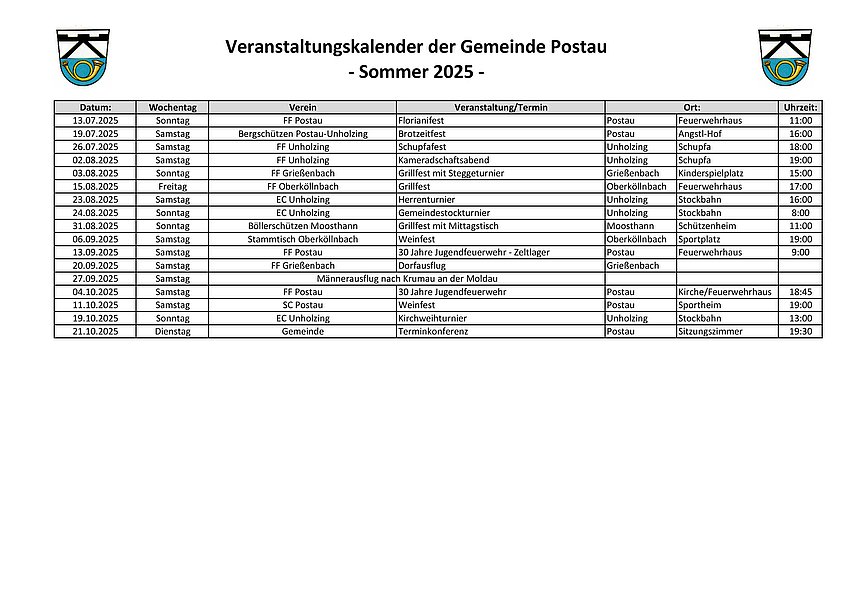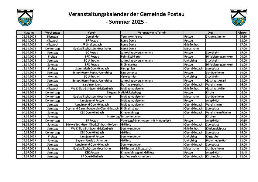 Veranstaltungskalender der Gemeinde Postau – Sommer 2025 –